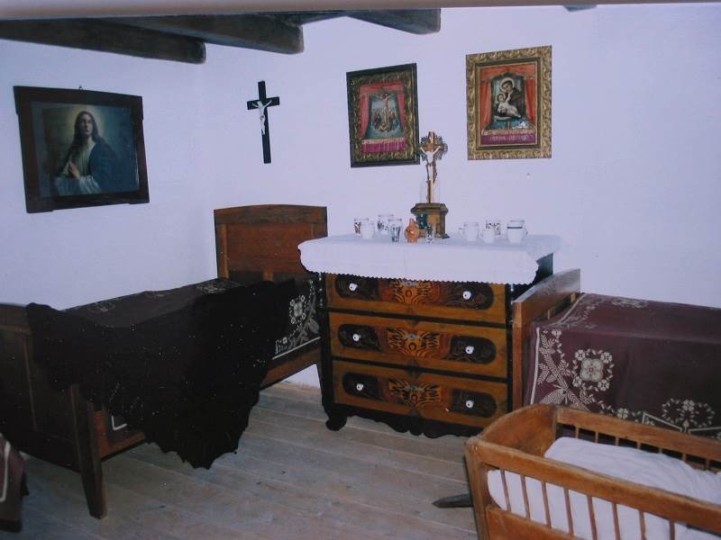 Dom ľudového bývania je trojpriestorový. Skladá sa z kuchyne, obytnej izby a komory. Kuchyňa s mohutnou zabudovanou pecou a historickým sporákom z roku 1930 je – podobne ako obytná izba – zariadená vzácnym historickým nábytkom a množstvom dobových predmetov a ľudovoumeleckých výrobkov. V komore so samostatným vstupom z dvora môžeme vidieť rôzne úžitkové predmety a náradie, napríklad pomôcky pri pečení chleba, ako je koryto, lis na zemiaky, slamenice, prútené košíky, lopár na sádzanie chleba do pece; taktiež rezač na kapustu, maselnicu, slamené zásobnice, koše na sušenie ovocia, drevené vyrezávané pracovné náradie a mnoho iného.