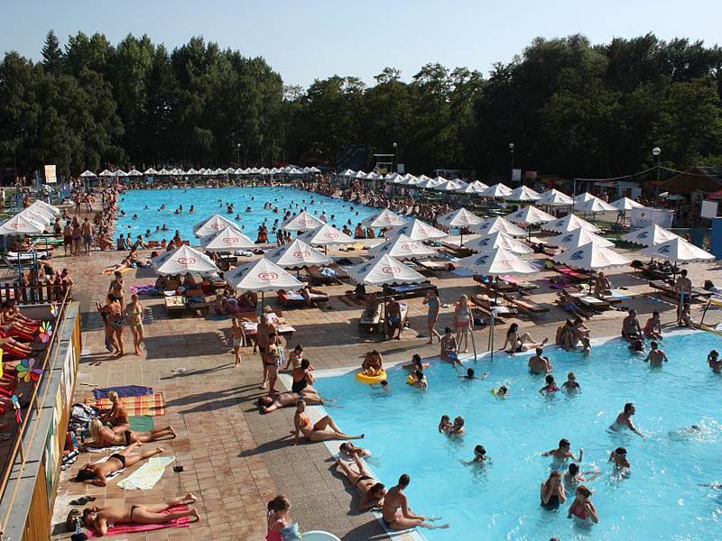 Na návštevníkov tu čakajú 4 bazény napĺňané termálnou vodou s teplotou 25°C a obsahom minerálnych solí cca 1020 mg/l. Nájdeme tu veľký laminátový plavecký bazén s dĺžkou 50 m a malý laminátový bazén vhodný pre odrastenejšie deti. Tieto dva bazény sú prevádzkované modernou technológiou neustálej cirkulácie vody. Pre deti do 6 rokov je určený najmenší bazén s hĺbkou vody 30 – 40 cm, v ktorom sa nachádza malý vodný hríb a šmykľavka. Rodičia môžu na deti dozerať z vodou obmývaného plážového vstupu do bazéna. Skladbu bazénov dopĺňa obľúbený veľký rekreačný bazén s vodným hríbom a 10 m dlhým vodným sklzom. Bazén má vytvorený pozvoľný, tzv. plážový vstup, kde hĺbka vody začína od 0 cm a pomaly sa zvažuje. Tento priestor je ideálny na opaľovanie a slnenie.