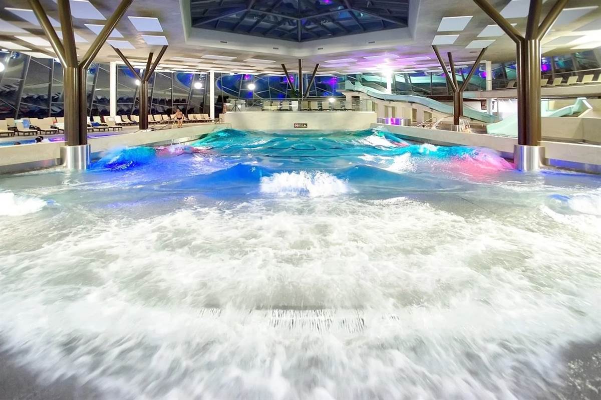 V celoročne prístupnej bazénovej hale sa nachádza vnútorný relaxačný a vnútorný masážny bazén, oba s najrôznejšími masážnymi prvkami, taktiež vnútorný športový bazén so simuláciou morského vlnenia a dnovou perličkovou masážou a napokon vnútorný detský bazén plný rozličných detských zábavných prvkov.